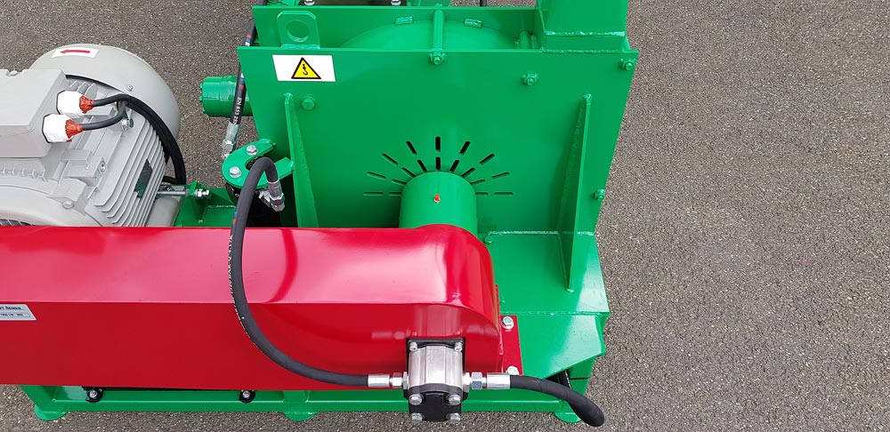 Gép ágak, hulladék és fahulladék aprítására. Az anyag aprítása a gép lendkerekére csavarozott három késsel történik. Két adagolóhenger van. A gép saját hidraulikakörrel van felszerelve, és nagy teljesítményű 11 KW-os villanymotor hajtja. Az adagolási sebesség szabályozható, ami a forgács méretét - hosszát is beállítja. A zúzógép leveles, tűleveles, elágazó, száraz, nedves ágakat, valamint deszkákat és gerendákat vesz fel.